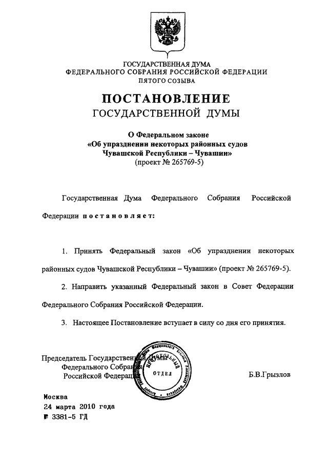 "О ФЕДЕРАЛЬНОМ ЗАКОНЕ "ОБ УПРАЗДНЕНИИ НЕКОТОРЫХ РАЙОННЫХ СУДОВ ЧУВАШСКОЙ РЕСПУБЛИКИ - ЧУВАШИИ" (ПРОЕКТ N 265769-5)"