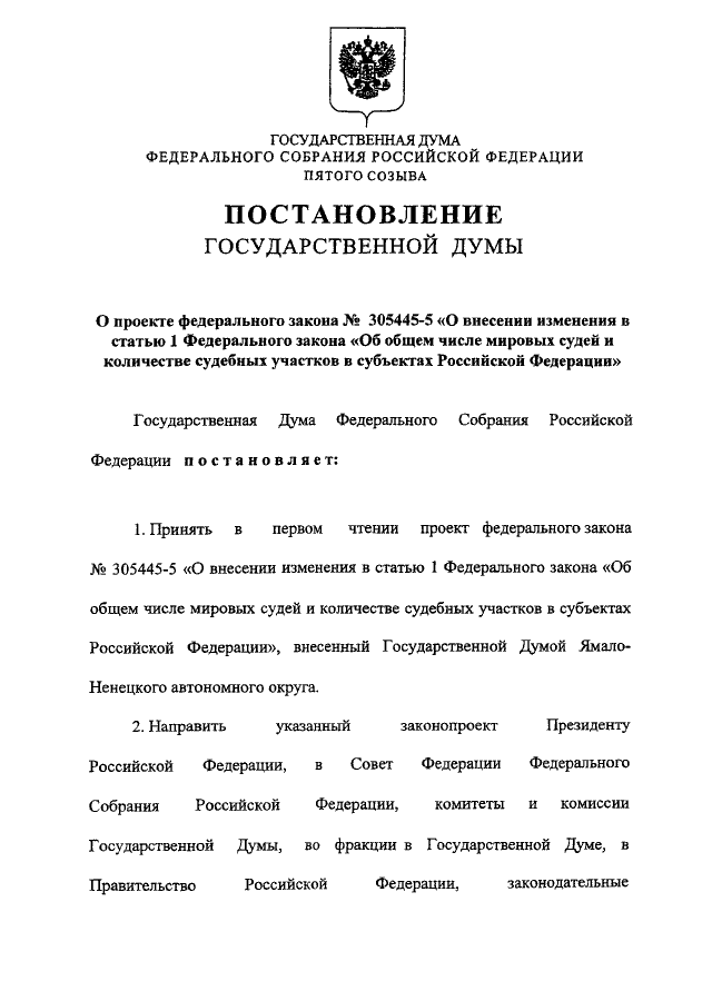 "О ПРОЕКТЕ ФЕДЕРАЛЬНОГО ЗАКОНА N 305445-5 "О ВНЕСЕНИИ ИЗМЕНЕНИЯ В СТАТЬЮ 1 ФЕДЕРАЛЬНОГО ЗАКОНА "ОБ ОБЩЕМ ЧИСЛЕ МИРОВЫХ СУДЕЙ И КОЛИЧЕСТВЕ СУДЕБНЫХ УЧАСТКОВ В СУБЪЕКТАХ РОССИЙСКОЙ ФЕДЕРАЦИИ"