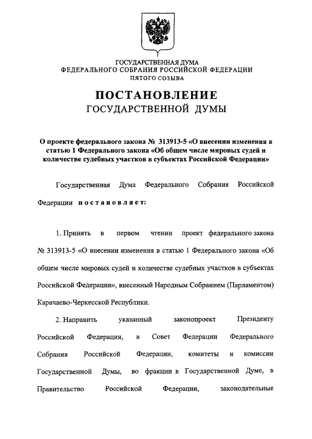 "О ПРОЕКТЕ ФЕДЕРАЛЬНОГО ЗАКОНА N 313913-5 "О ВНЕСЕНИИ ИЗМЕНЕНИЯ В СТАТЬЮ 1 ФЕДЕРАЛЬНОГО ЗАКОНА "ОБ ОБЩЕМ ЧИСЛЕ МИРОВЫХ СУДЕЙ И КОЛИЧЕСТВЕ СУДЕБНЫХ УЧАСТКОВ В СУБЪЕКТАХ РОССИЙСКОЙ ФЕДЕРАЦИИ"