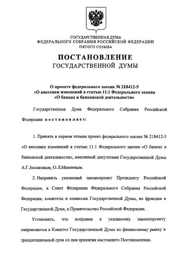 "О ПРОЕКТЕ ФЕДЕРАЛЬНОГО ЗАКОНА N 218412-5 "О ВНЕСЕНИИ ИЗМЕНЕНИЙ В СТАТЬЮ 11.1 ФЕДЕРАЛЬНОГО ЗАКОНА "О БАНКАХ И БАНКОВСКОЙ ДЕЯТЕЛЬНОСТИ"