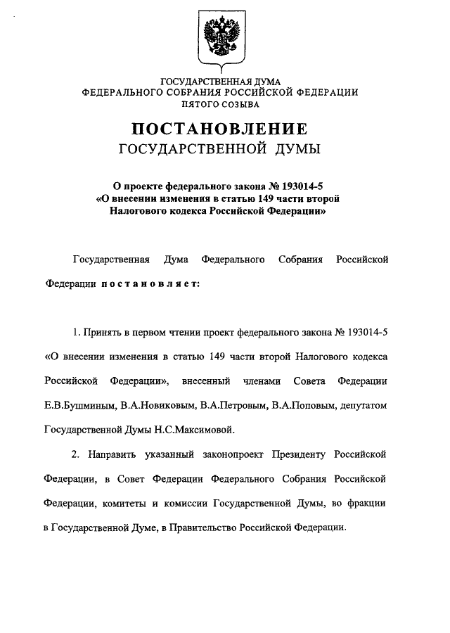 "О ПРОЕКТЕ ФЕДЕРАЛЬНОГО ЗАКОНА N 193014-5 "О ВНЕСЕНИИ ИЗМЕНЕНИЯ В СТАТЬЮ 149 ЧАСТИ ВТОРОЙ НАЛОГОВОГО КОДЕКСА РОССИЙСКОЙ ФЕДЕРАЦИИ"