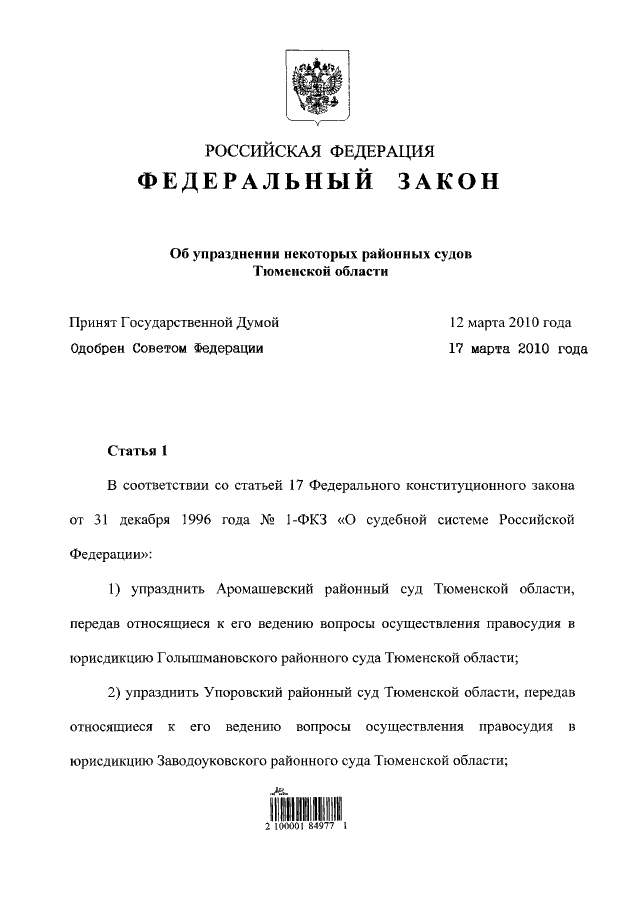 "ОБ УПРАЗДНЕНИИ НЕКОТОРЫХ РАЙОННЫХ СУДОВ ТЮМЕНСКОЙ ОБЛАСТИ"
