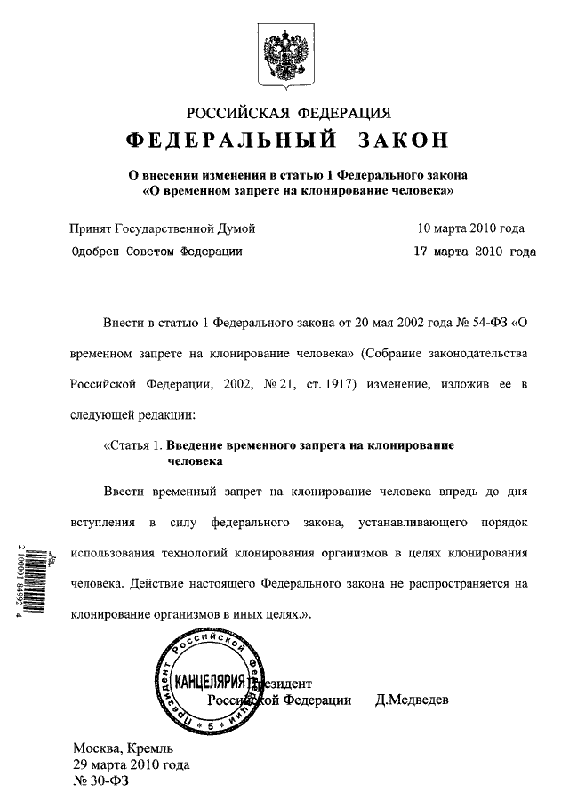 "О ВНЕСЕНИИ ИЗМЕНЕНИЯ В СТАТЬЮ 1 ФЕДЕРАЛЬНОГО ЗАКОНА "О ВРЕМЕННОМ ЗАПРЕТЕ НА КЛОНИРОВАНИЕ ЧЕЛОВЕКА"