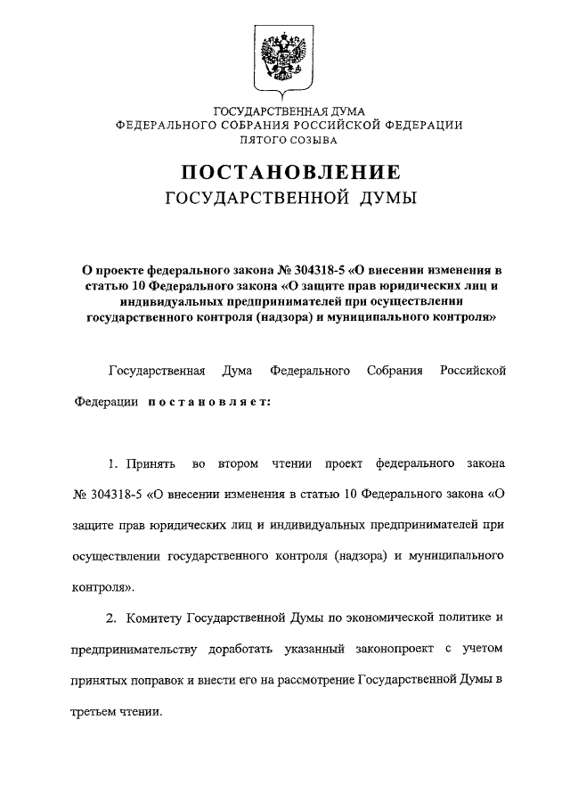 "О ПРОЕКТЕ ФЕДЕРАЛЬНОГО ЗАКОНА N 304318-5 "О ВНЕСЕНИИ ИЗМЕНЕНИЯ В