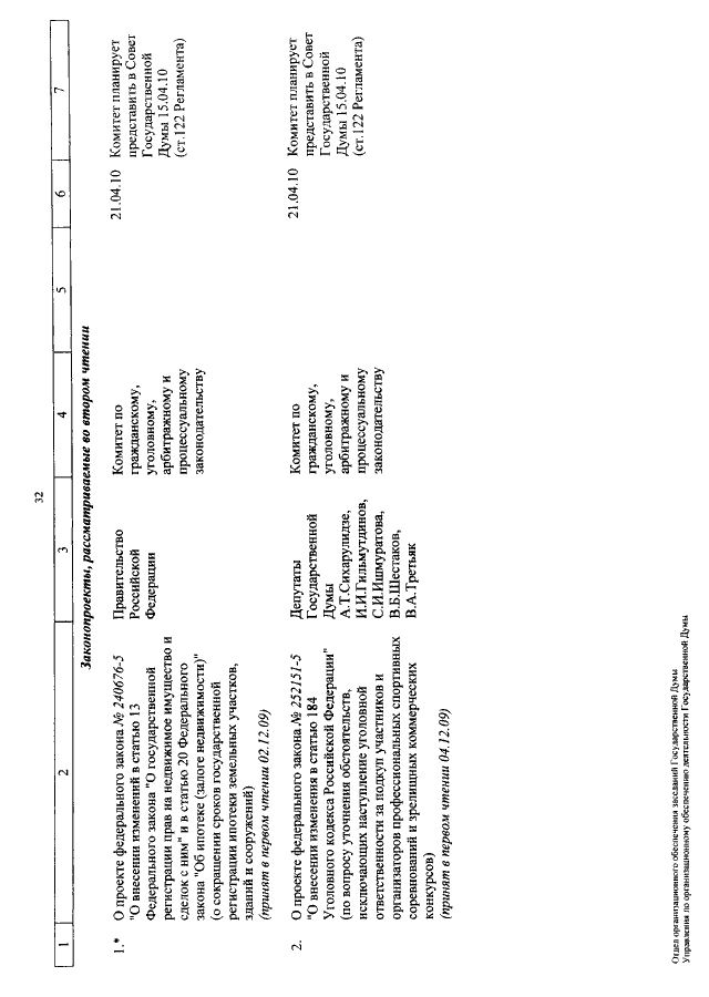 "О КАЛЕНДАРЕ РАССМОТРЕНИЯ ВОПРОСОВ ГОСУДАРСТВЕННОЙ ДУМОЙ С 7 ПО 23 АПРЕЛЯ 2010 ГОДА"