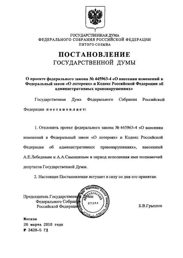 ПОСТАНОВЛЕНИЕ ГД ФС РФ от 26.03.2010 N 3428-5 ГД