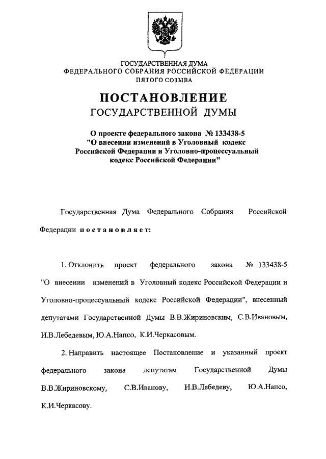 "О ПРОЕКТЕ ФЕДЕРАЛЬНОГО ЗАКОНА N 133438-5 "О ВНЕСЕНИИ ИЗМЕНЕНИЙ В УГОЛОВНЫЙ КОДЕКС РОССИЙСКОЙ ФЕДЕРАЦИИ И УГОЛОВНО - ПРОЦЕССУАЛЬНЫЙ КОДЕКС РОССИЙСКОЙ ФЕДЕРАЦИИ"