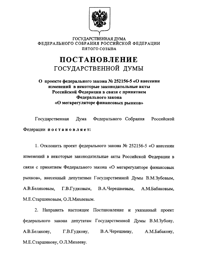 "О ПРОЕКТЕ ФЕДЕРАЛЬНОГО ЗАКОНА N 252156-5 "О ВНЕСЕНИИ ИЗМЕНЕНИЙ В НЕКОТОРЫЕ ЗАКОНОДАТЕЛЬНЫЕ АКТЫ РОССИЙСКОЙ ФЕДЕРАЦИИ В СВЯЗИ С ПРИНЯТИЕМ ФЕДЕРАЛЬНОГО ЗАКОНА "О МЕГАРЕГУЛЯТОРЕ ФИНАНСОВЫХ РЫНКОВ"