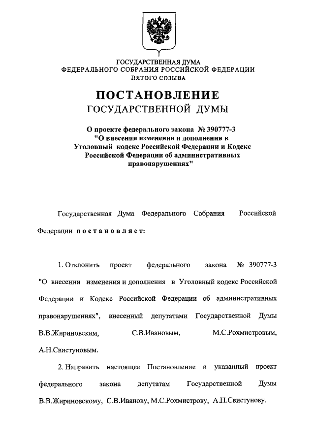 "О ПРОЕКТЕ ФЕДЕРАЛЬНОГО ЗАКОНА N 390777-3 "О ВНЕСЕНИИ ИЗМЕНЕНИЯ И ДОПОЛНЕНИЯ В УГОЛОВНЫЙ КОДЕКС РОССИЙСКОЙ ФЕДЕРАЦИИ И КОДЕКС РОССИЙСКОЙ ФЕДЕРАЦИИ ОБ АДМИНИСТРАТИВНЫХ ПРАВОНАРУШЕНИЯХ"