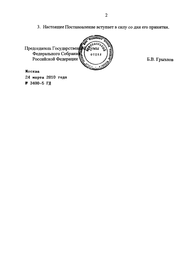 ПОСТАНОВЛЕНИЕ ГД ФС РФ от 24.03.2010 N 3400-5 ГД