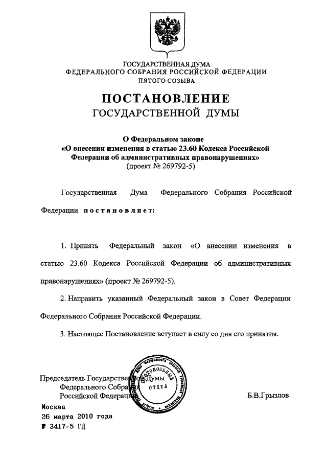 "О ФЕДЕРАЛЬНОМ ЗАКОНЕ "О ВНЕСЕНИИ ИЗМЕНЕНИЯ В СТАТЬЮ 23.60 КОДЕКСА РОССИЙСКОЙ ФЕДЕРАЦИИ ОБ АДМИНИСТРАТИВНЫХ ПРАВОНАРУШЕНИЯХ" (ПРОЕКТ N 269792-5)"