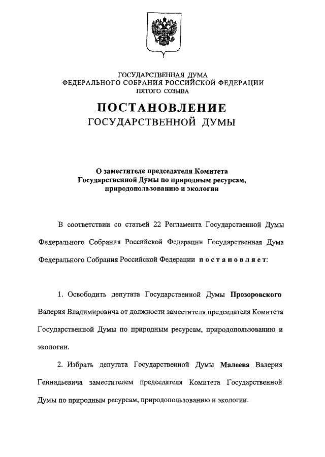 "О ЗАМЕСТИТЕЛЕ ПРЕДСЕДАТЕЛЯ КОМИТЕТА ГОСУДАРСТВЕННОЙ ДУМЫ ПО ПРИРОДНЫМ РЕСУРСАМ, ПРИРОДОПОЛЬЗОВАНИЮ И ЭКОЛОГИИ"
