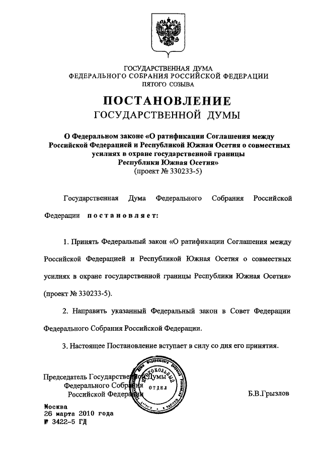 ПОСТАНОВЛЕНИЕ ГД ФС РФ от 26.03.2010 N 3422-5 ГД