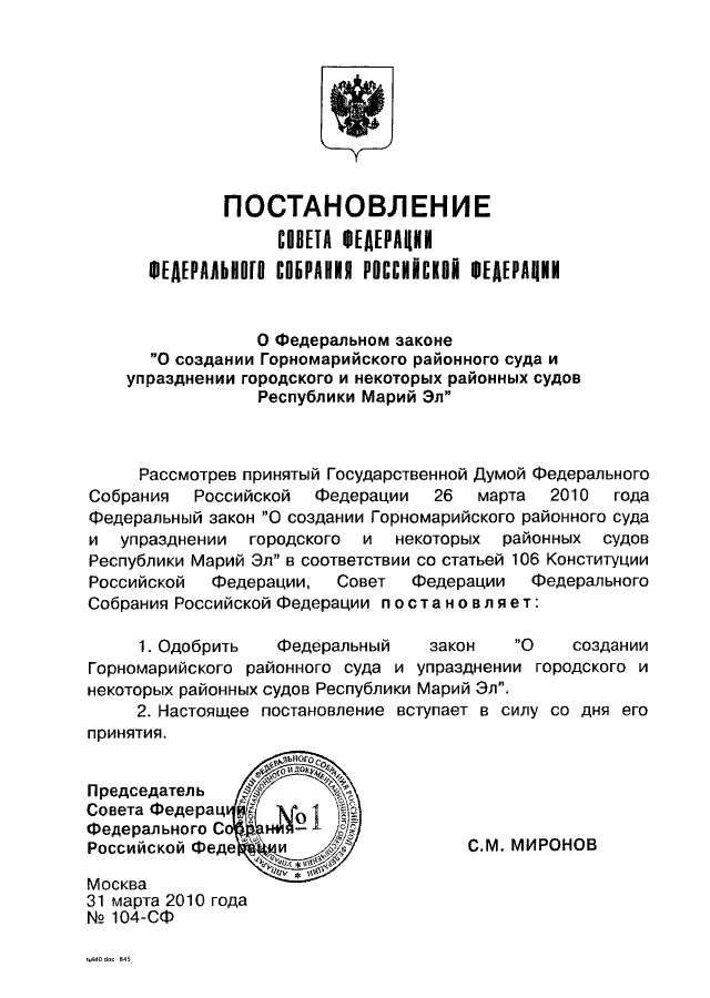 ПОСТАНОВЛЕНИЕ СФ ФС РФ от 31.03.2010 N 104-СФ