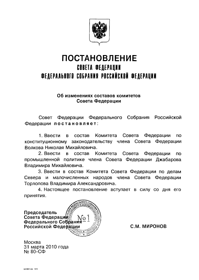 ПОСТАНОВЛЕНИЕ СФ ФС РФ от 31.03.2010 N 80-СФ