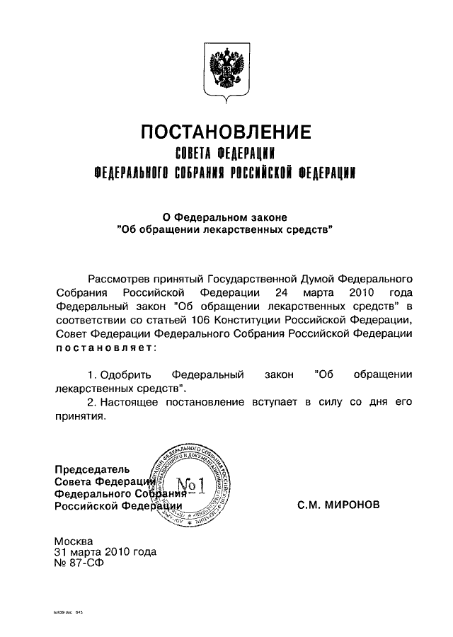 ПОСТАНОВЛЕНИЕ СФ ФС РФ от 31.03.2010 N 87-СФ