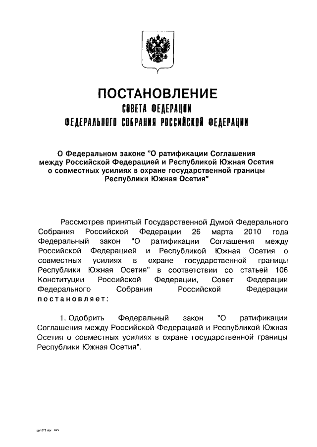 "О ФЕДЕРАЛЬНОМ ЗАКОНЕ "О РАТИФИКАЦИИ СОГЛАШЕНИЯ МЕЖДУ РОССИЙСКОЙ ФЕДЕРАЦИЕЙ И РЕСПУБЛИКОЙ ЮЖНАЯ ОСЕТИЯ О СОВМЕСТНЫХ УСИЛИЯХ В ОХРАНЕ ГОСУДАРСТВЕННОЙ ГРАНИЦЫ РЕСПУБЛИКИ ЮЖНАЯ ОСЕТИЯ"