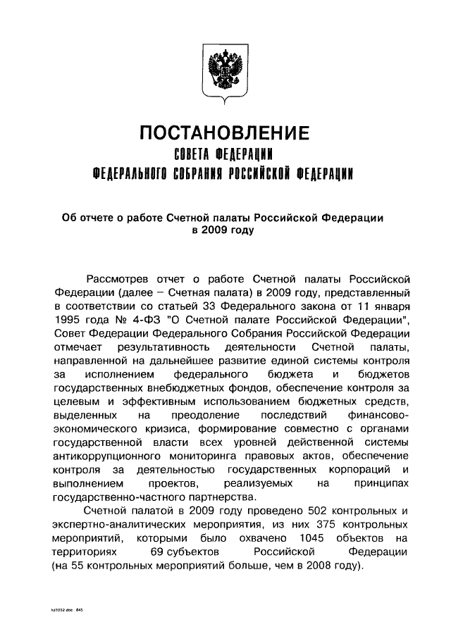 "ОБ ОТЧЕТЕ О РАБОТЕ СЧЕТНОЙ ПАЛАТЫ РОССИЙСКОЙ ФЕДЕРАЦИИ В 2009 ГОДУ"