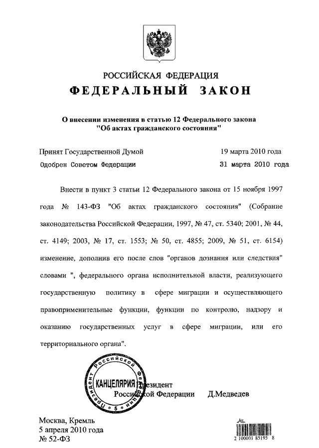 ФЕДЕРАЛЬНЫЙ ЗАКОН от 05.04.2010 N 52-ФЗ