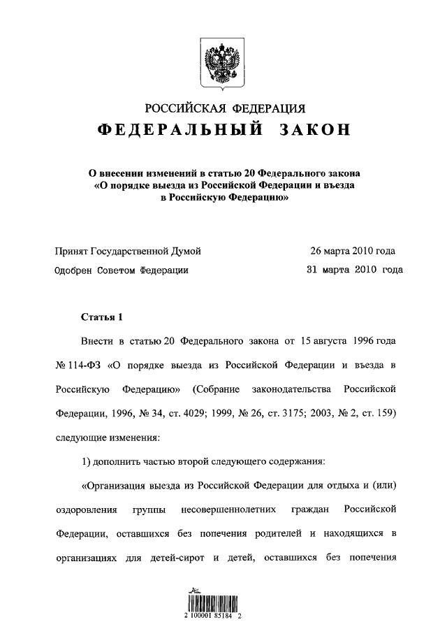 "О ВНЕСЕНИИ ИЗМЕНЕНИЙ В СТАТЬЮ 20 ФЕДЕРАЛЬНОГО ЗАКОНА "О ПОРЯДКЕ ВЫЕЗДА ИЗ РОССИЙСКОЙ ФЕДЕРАЦИИ И ВЪЕЗДА В РОССИЙСКУЮ ФЕДЕРАЦИЮ"