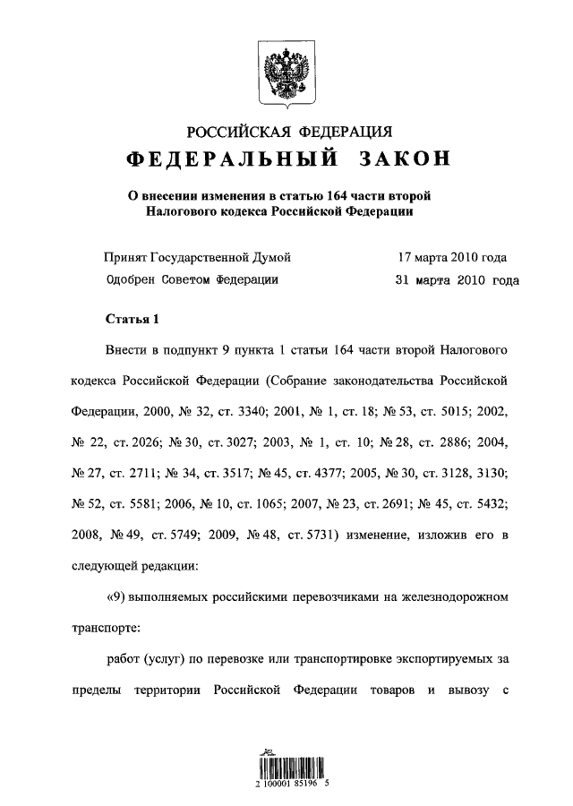 "О ВНЕСЕНИИ ИЗМЕНЕНИЯ В СТАТЬЮ 164 ЧАСТИ ВТОРОЙ НАЛОГОВОГО КОДЕКСА РОССИЙСКОЙ ФЕДЕРАЦИИ"
