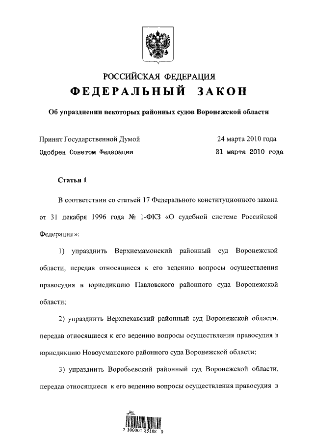 "ОБ УПРАЗДНЕНИИ НЕКОТОРЫХ РАЙОННЫХ СУДОВ ВОРОНЕЖСКОЙ ОБЛАСТИ"