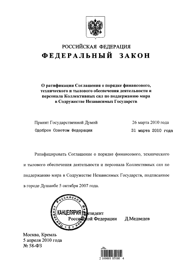 ФЕДЕРАЛЬНЫЙ ЗАКОН от 05.04.2010 N 58-ФЗ