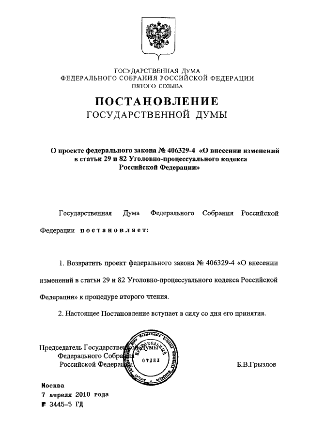 ПОСТАНОВЛЕНИЕ ГД ФС РФ от 07.04.2010 N 3445-5 ГД