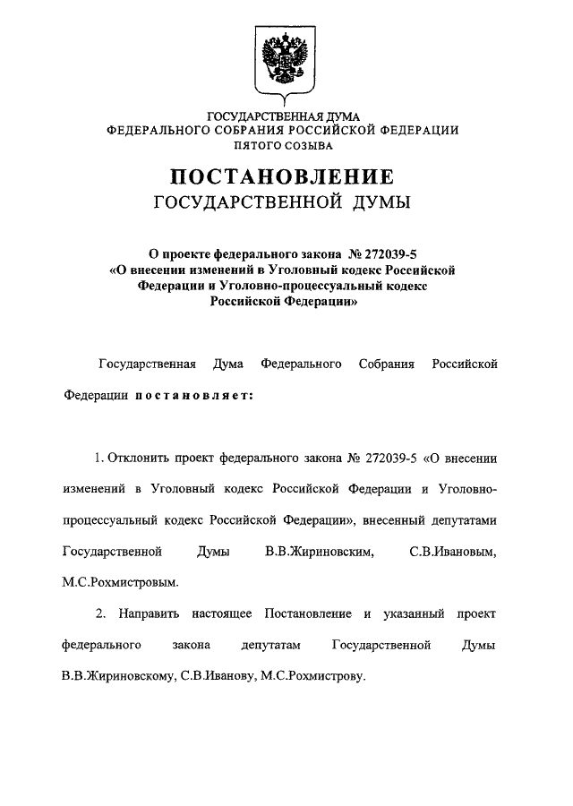 "О ПРОЕКТЕ ФЕДЕРАЛЬНОГО ЗАКОНА N 272039-5 "О ВНЕСЕНИИ ИЗМЕНЕНИЙ В УГОЛОВНЫЙ КОДЕКС РОССИЙСКОЙ ФЕДЕРАЦИИ И УГОЛОВНО - ПРОЦЕССУАЛЬНЫЙ КОДЕКС РОССИЙСКОЙ ФЕДЕРАЦИИ"