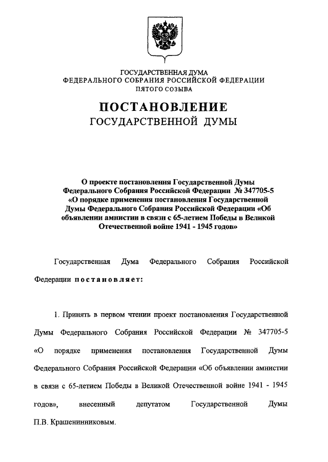 "О ПРОЕКТЕ ПОСТАНОВЛЕНИЯ ГОСУДАРСТВЕННОЙ ДУМЫ ФЕДЕРАЛЬНОГО СОБРАНИЯ РОССИЙСКОЙ ФЕДЕРАЦИИ N 347705-5 "О ПОРЯДКЕ ПРИМЕНЕНИЯ ПОСТАНОВЛЕНИЯ ГОСУДАРСТВЕННОЙ ДУМЫ ФЕДЕРАЛЬНОГО СОБРАНИЯ РОССИЙСКОЙ ФЕДЕРАЦИИ "ОБ ОБЪЯВЛЕНИИ АМНИСТИИ В СВЯЗИ С 65-ЛЕТИЕМ ПОБЕДЫ В ВЕЛИКОЙ ОТЕЧЕСТВЕННОЙ ВОЙНЕ 1941 - 1945 ГОДОВ"