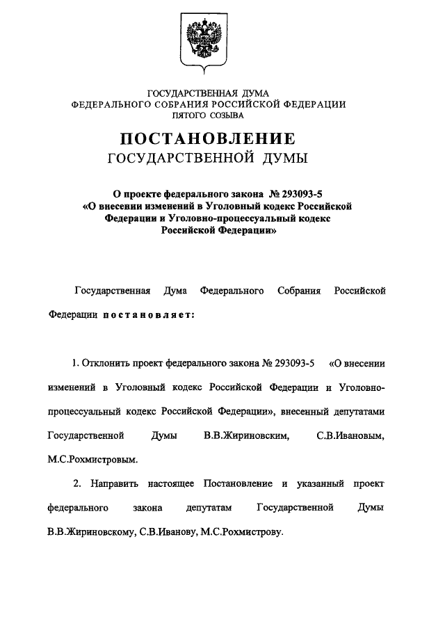 "О ПРОЕКТЕ ФЕДЕРАЛЬНОГО ЗАКОНА N 293093-5 "О ВНЕСЕНИИ ИЗМЕНЕНИЙ В УГОЛОВНЫЙ КОДЕКС РОССИЙСКОЙ ФЕДЕРАЦИИ И УГОЛОВНО - ПРОЦЕССУАЛЬНЫЙ КОДЕКС РОССИЙСКОЙ ФЕДЕРАЦИИ"