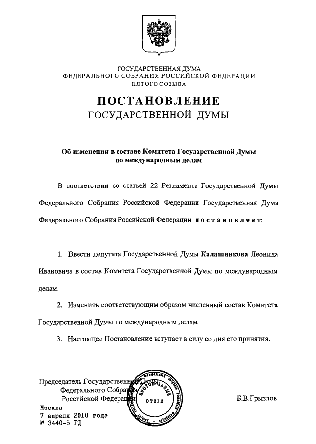 ПОСТАНОВЛЕНИЕ ГД ФС РФ от 07.04.2010 N 3440-5 ГД