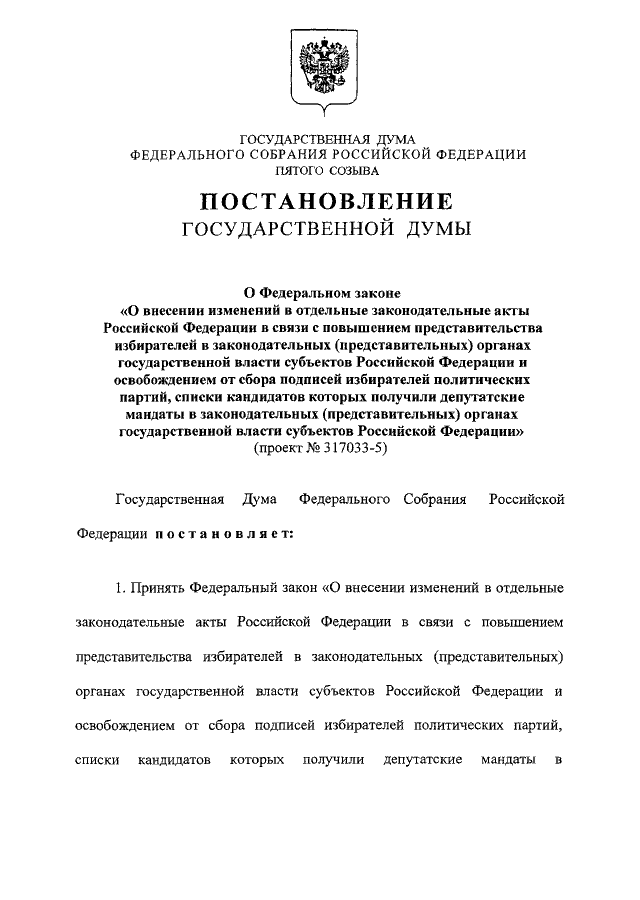 "О ФЕДЕРАЛЬНОМ ЗАКОНЕ "О ВНЕСЕНИИ ИЗМЕНЕНИЙ В ОТДЕЛЬНЫЕ ЗАКОНОДАТЕЛЬНЫЕ АКТЫ РОССИЙСКОЙ ФЕДЕРАЦИИ В СВЯЗИ С ПОВЫШЕНИЕМ ПРЕДСТАВИТЕЛЬСТВА ИЗБИРАТЕЛЕЙ В ЗАКОНОДАТЕЛЬНЫХ (ПРЕДСТАВИТЕЛЬНЫХ) ОРГАНАХ ГОСУДАРСТВЕННОЙ ВЛАСТИ СУБЪЕКТОВ РОССИЙСКОЙ ФЕДЕРАЦИИ И ОСВОБОЖДЕНИЕМ ОТ СБОРА ПОДПИСЕЙ ИЗБИРАТЕЛЕЙ ПОЛИТИЧЕСКИХ ПАРТИЙ, СПИСКИ КАНДИДАТОВ КОТОРЫХ ПОЛУЧИЛИ ДЕПУТАТСКИЕ МАНДАТЫ В ЗАКОНОДАТЕЛЬНЫХ (ПРЕДСТАВИТЕЛЬНЫХ) ОРГАНАХ ГОСУДАРСТВЕННОЙ ВЛАСТИ СУБЪЕКТОВ РОССИЙСКОЙ ФЕДЕРАЦИИ" (ПРОЕКТ N 317033-5)"