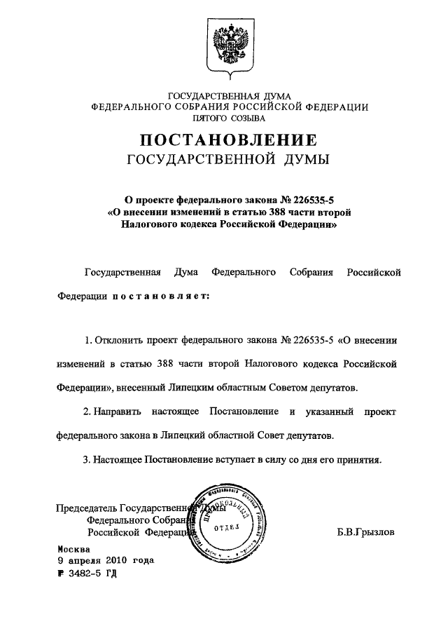 ПОСТАНОВЛЕНИЕ ГД ФС РФ от 09.04.2010 N 3482-5 ГД