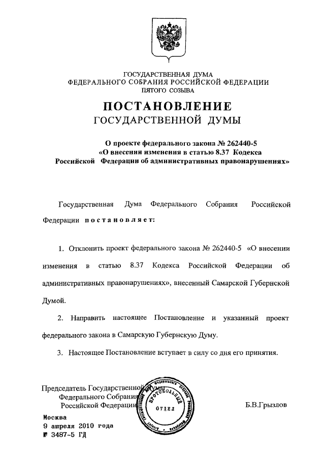 ПОСТАНОВЛЕНИЕ ГД ФС РФ от 09.04.2010 N 3487-5 ГД