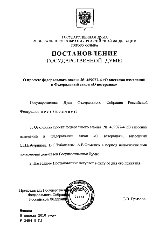 ПОСТАНОВЛЕНИЕ ГД ФС РФ от 09.04.2010 N 3484-5 ГД
