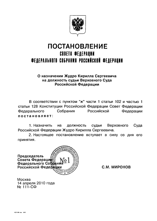 "О НАЗНАЧЕНИИ ЖУДРО КИРИЛЛА СЕРГЕЕВИЧА НА ДОЛЖНОСТЬ СУДЬИ ВЕРХОВНОГО СУДА РОССИЙСКОЙ ФЕДЕРАЦИИ"