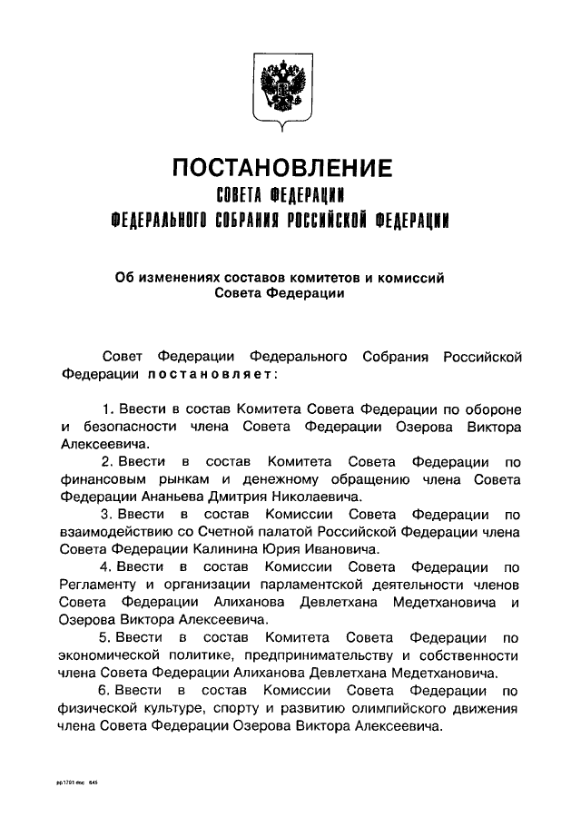"ОБ ИЗМЕНЕНИЯХ СОСТАВОВ КОМИТЕТОВ И КОМИССИЙ СОВЕТА ФЕДЕРАЦИИ"