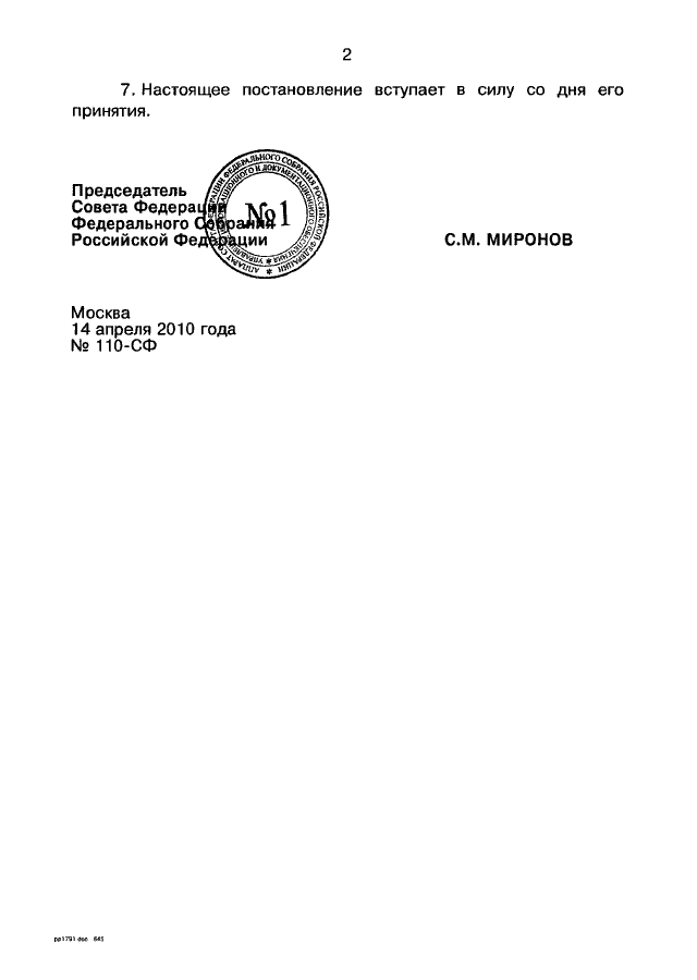ПОСТАНОВЛЕНИЕ СФ ФС РФ от 14.04.2010 N 110-СФ