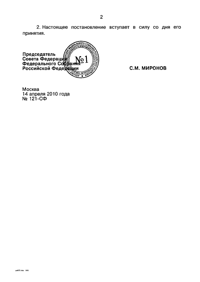 ПОСТАНОВЛЕНИЕ СФ ФС РФ от 14.04.2010 N 121-СФ