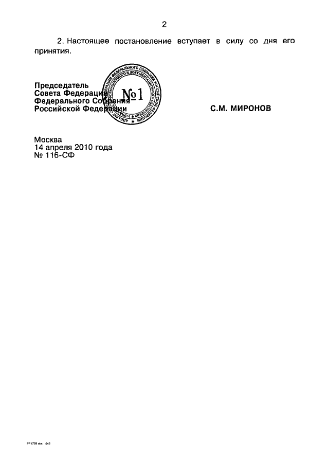ПОСТАНОВЛЕНИЕ СФ ФС РФ от 14.04.2010 N 116-СФ