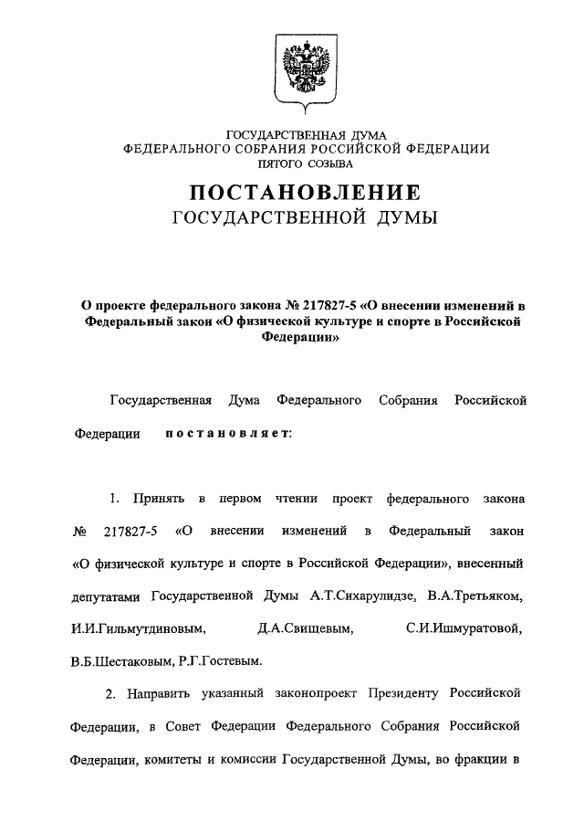 "О ПРОЕКТЕ ФЕДЕРАЛЬНОГО ЗАКОНА N 217827-5 "О ВНЕСЕНИИ ИЗМЕНЕНИЙ В ФЕДЕРАЛЬНЫЙ ЗАКОН "О ФИЗИЧЕСКОЙ КУЛЬТУРЕ И СПОРТЕ В РОССИЙСКОЙ ФЕДЕРАЦИИ"