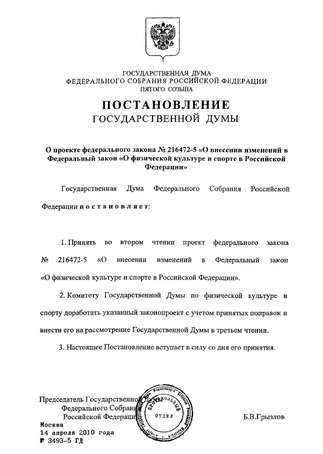 ПОСТАНОВЛЕНИЕ ГД ФС РФ от 14.04.2010 N 3493-5 ГД