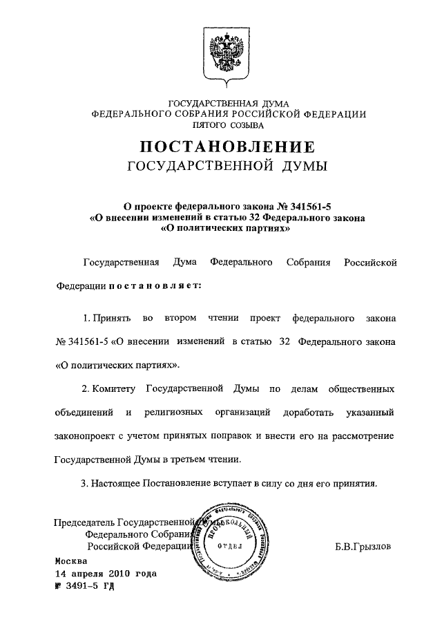 ПОСТАНОВЛЕНИЕ ГД ФС РФ от 14.04.2010 N 3491-5 ГД