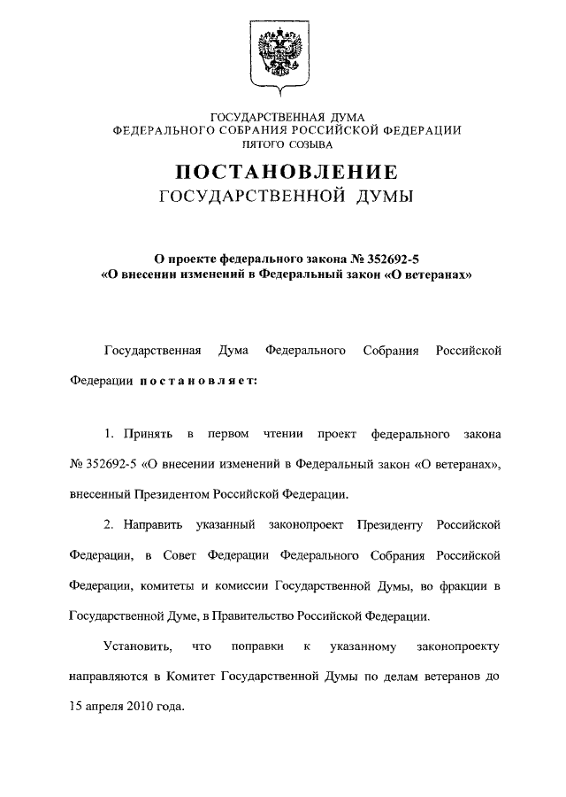 "О ПРОЕКТЕ ФЕДЕРАЛЬНОГО ЗАКОНА N 352692-5 "О ВНЕСЕНИИ ИЗМЕНЕНИЙ В ФЕДЕРАЛЬНЫЙ ЗАКОН "О ВЕТЕРАНАХ"