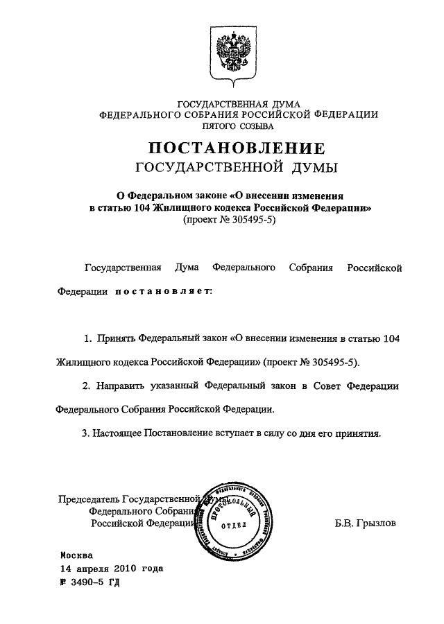 "О ФЕДЕРАЛЬНОМ ЗАКОНЕ "О ВНЕСЕНИИ ИЗМЕНЕНИЯ В СТАТЬЮ 104 ЖИЛИЩНОГО КОДЕКСА РОССИЙСКОЙ ФЕДЕРАЦИИ" (ПРОЕКТ N 305495-5)"
