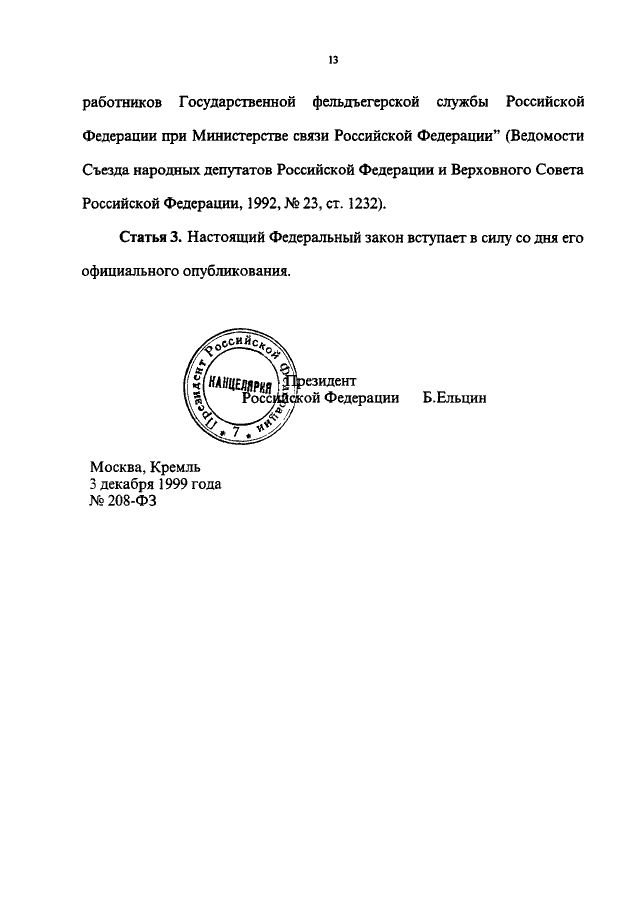 ФЕДЕРАЛЬНЫЙ ЗАКОН от 03.12.1999 N 208-ФЗ