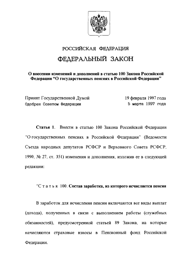 "О ВНЕСЕНИИ ИЗМЕНЕНИЙ И ДОПОЛНЕНИЙ В СТАТЬЮ 100 ЗАКОНА РОССИЙСКОЙ ФЕДЕРАЦИИ "О ГОСУДАРСТВЕННЫХ ПЕНСИЯХ В РОССИЙСКОЙ ФЕДЕРАЦИИ"