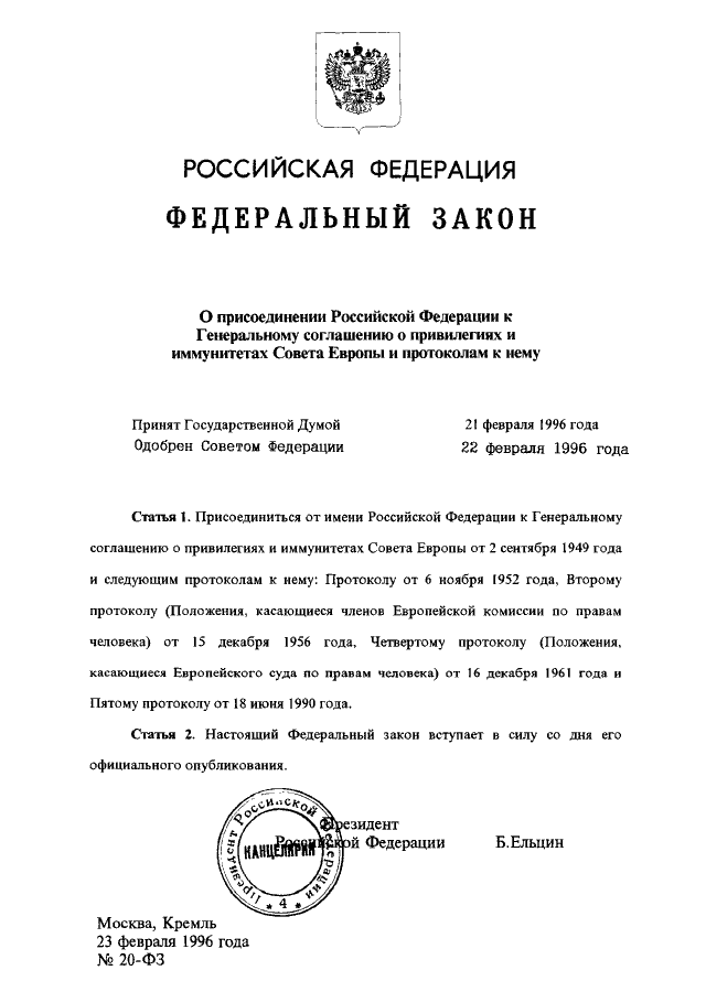 ФЕДЕРАЛЬНЫЙ ЗАКОН от 23.02.1996 N 20-ФЗ