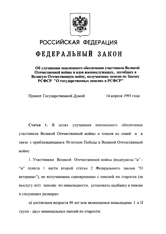 "ОБ УЛУЧШЕНИИ ПЕНСИОННОГО ОБЕСПЕЧЕНИЯ УЧАСТНИКОВ ВЕЛИКОЙ